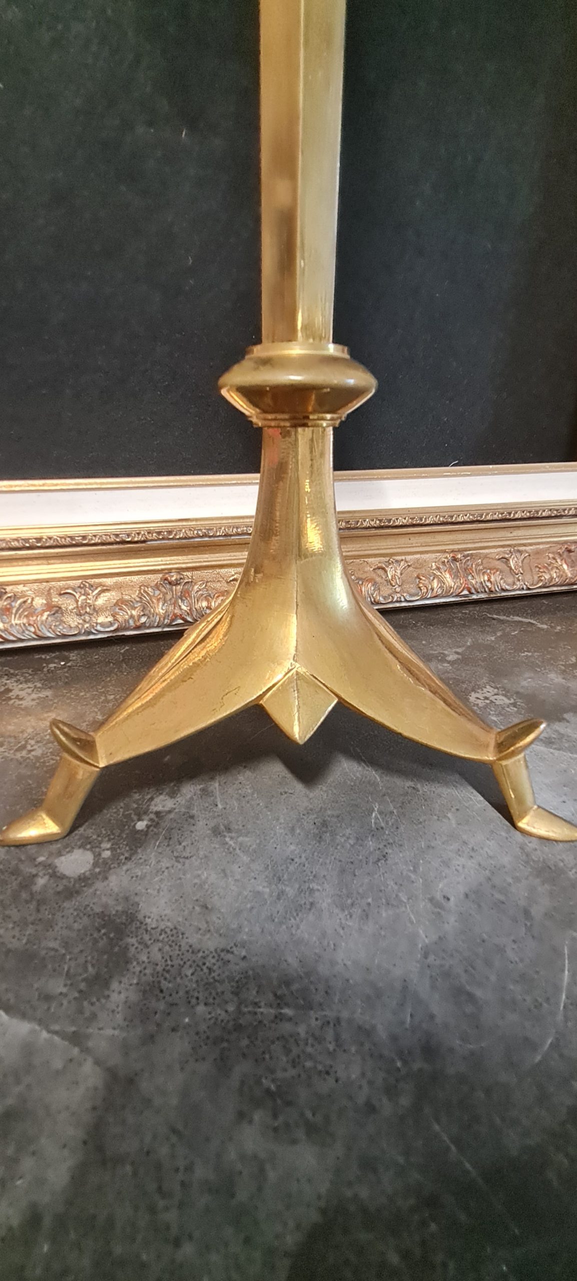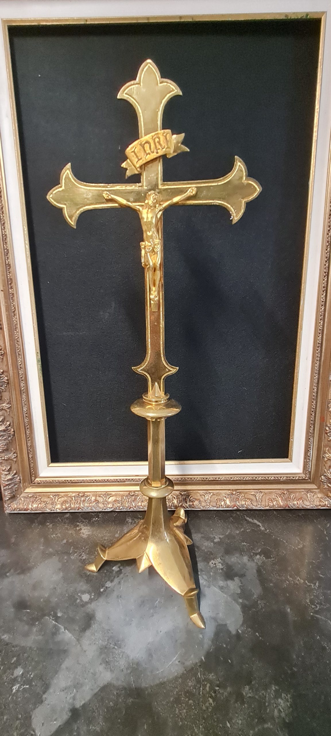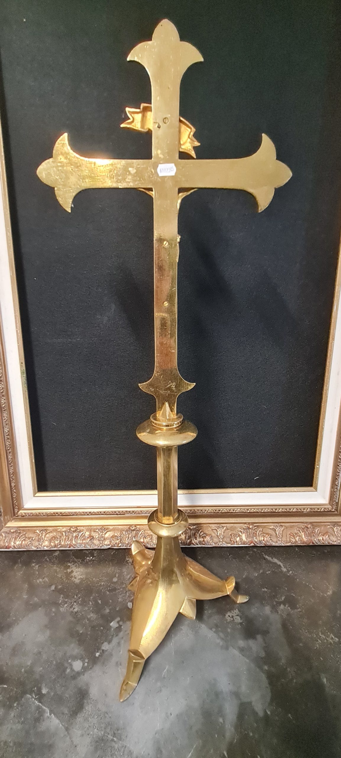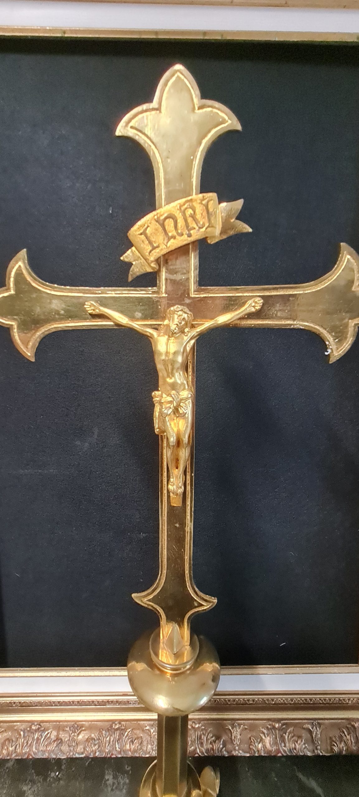 Très belle croix d’autel reposant sur un empiètement trilobé et stylisé, le fût a 2 bagues, la croix fleuronnée porte un Christ représenté vivant et couronné d’épines. Modèle de