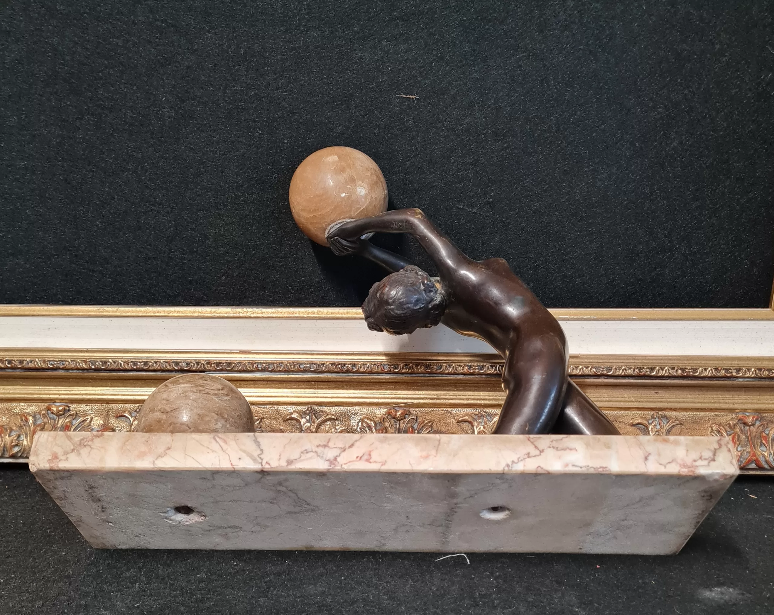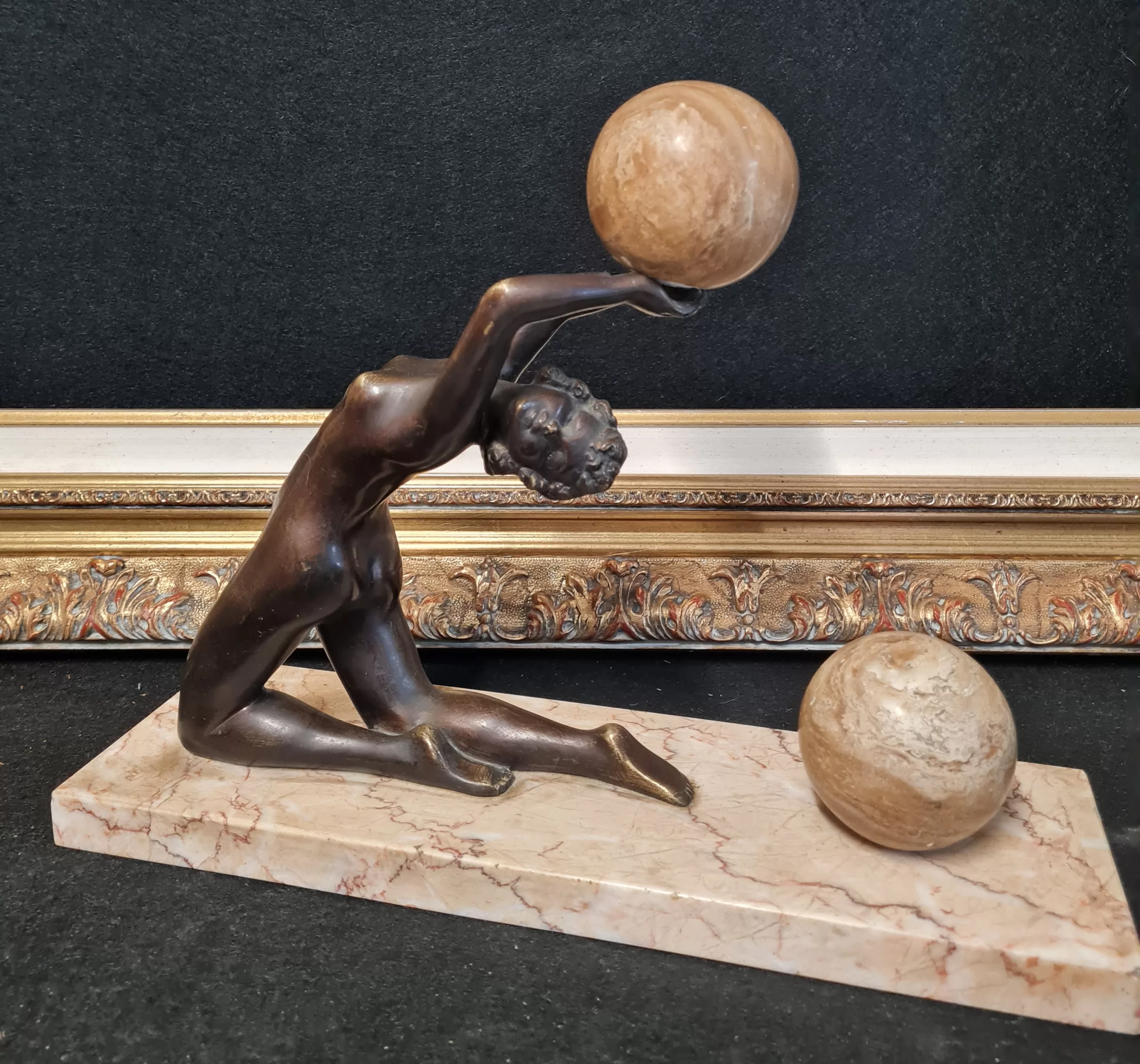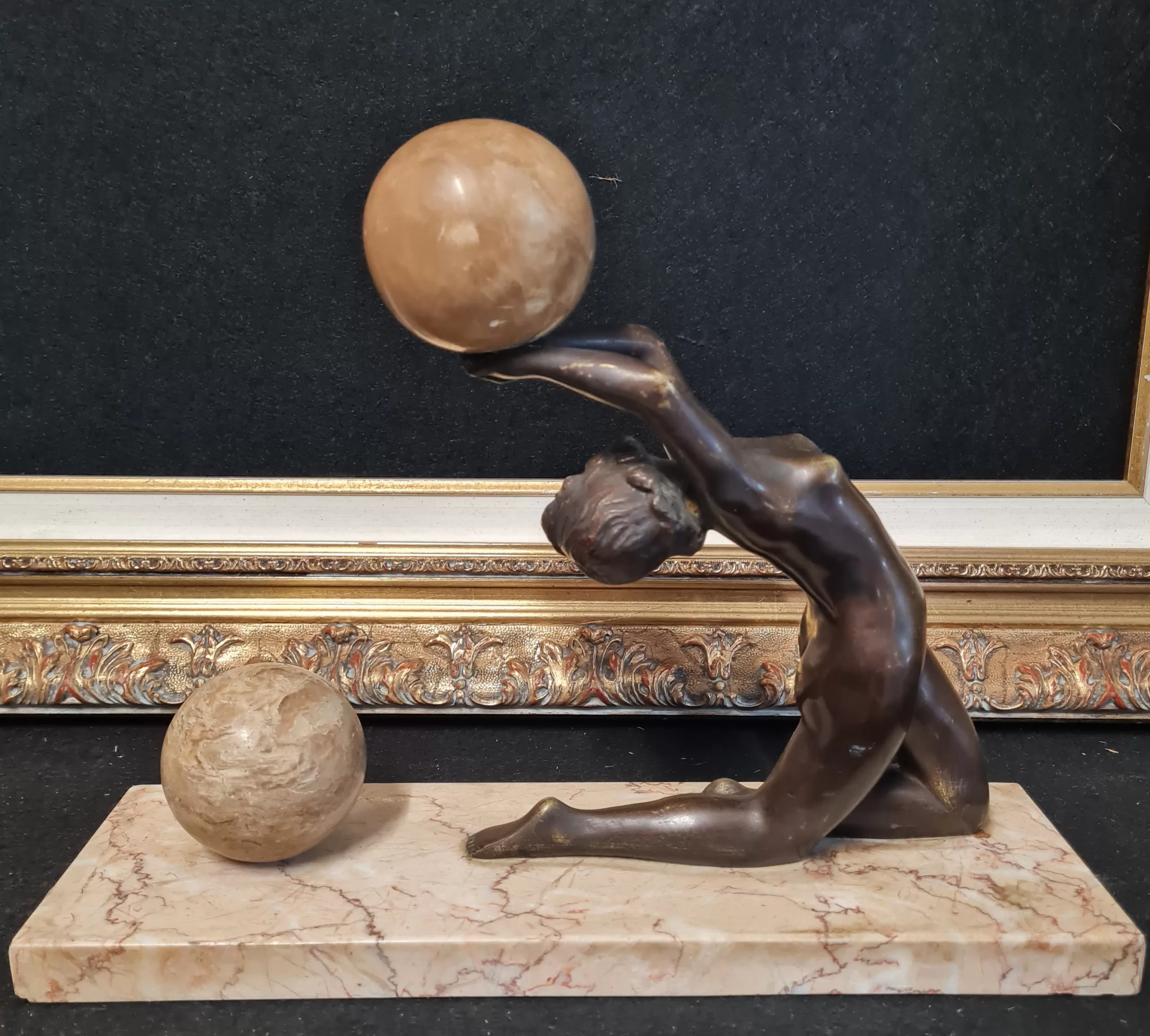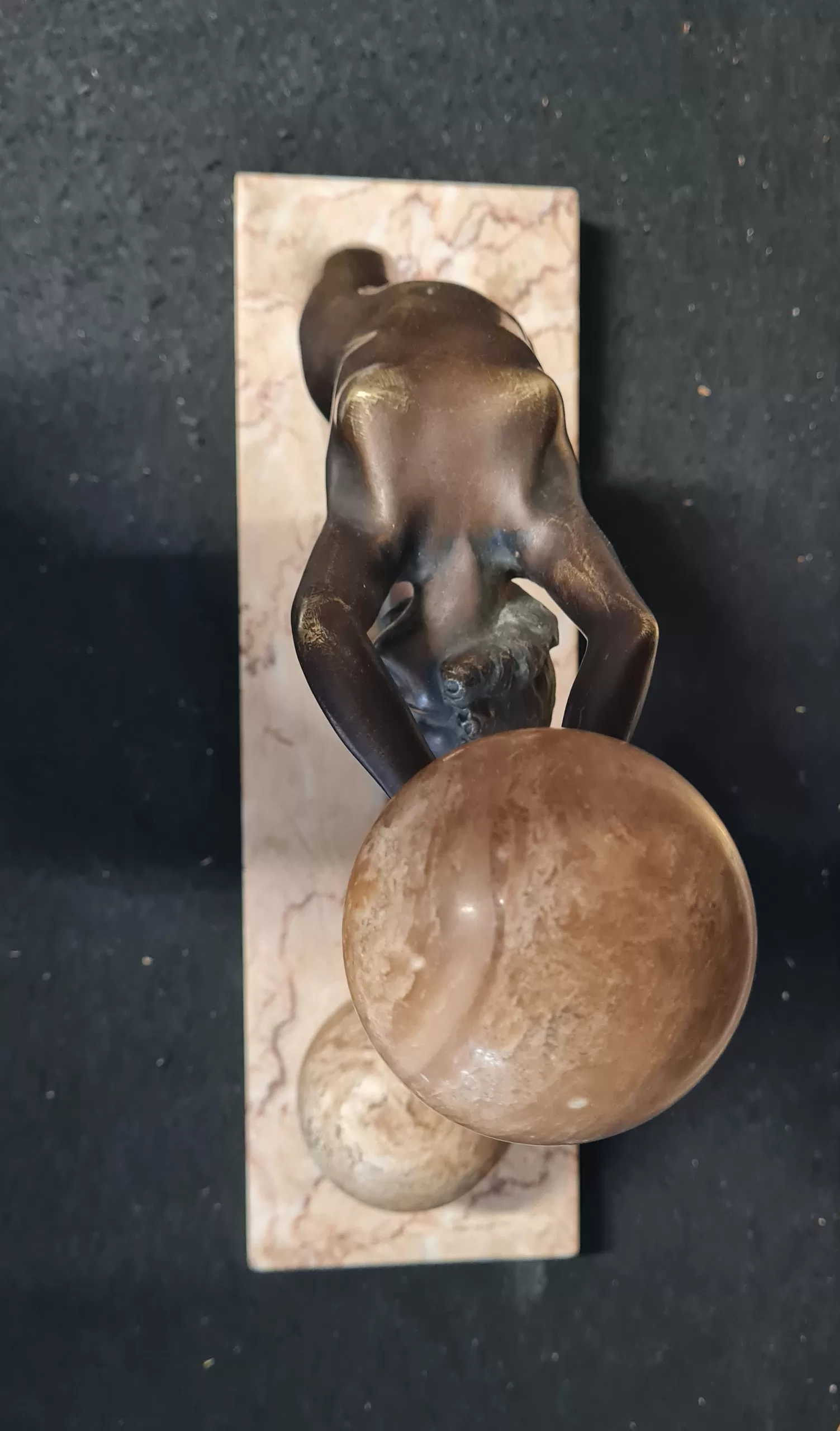 Jolie et élégante sculpture en bronze de Salvatore MELANI (1930) patiné marron foncé socle rectangulaire en marbre. 2 boules d’origine en onyx marron.