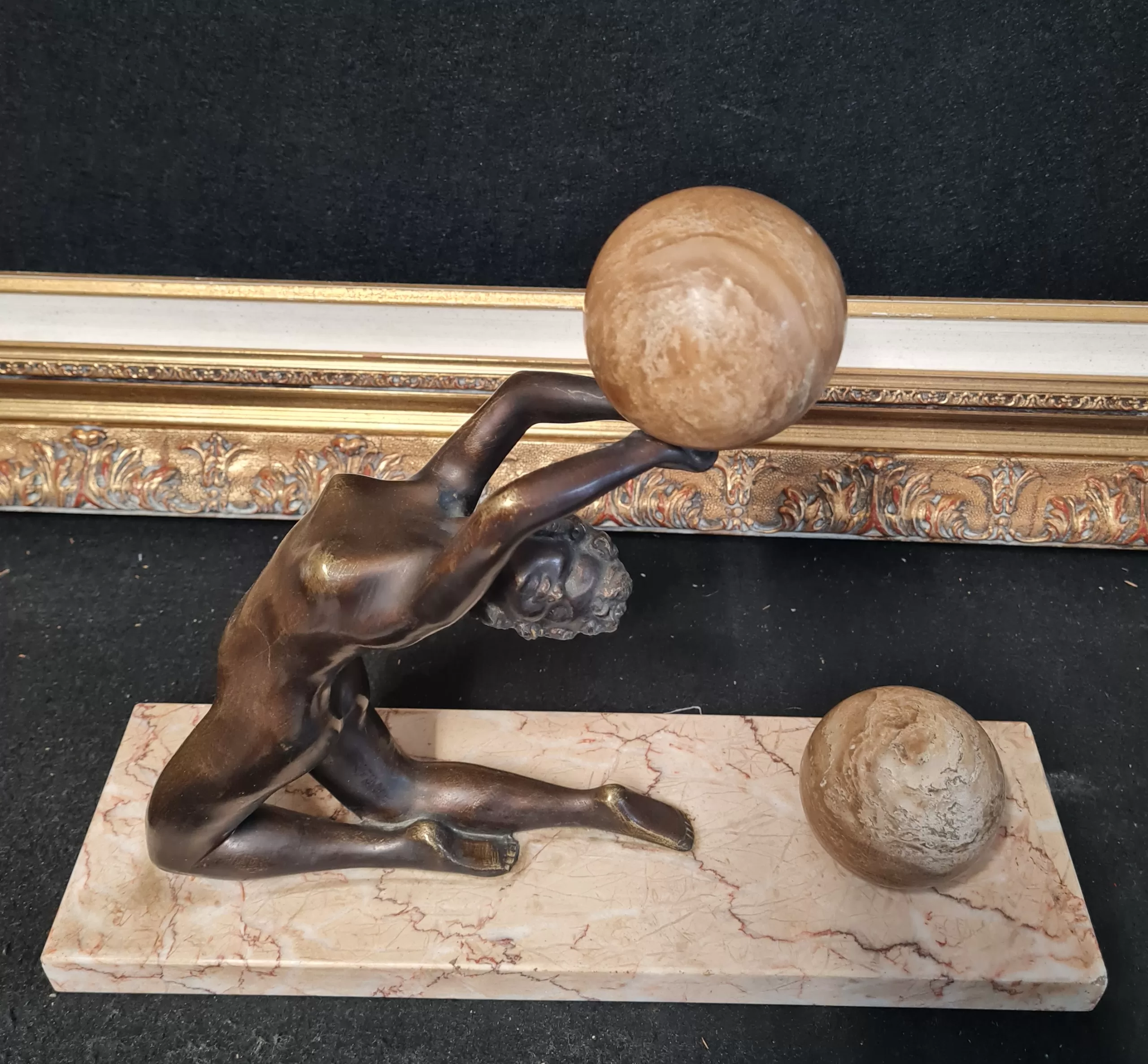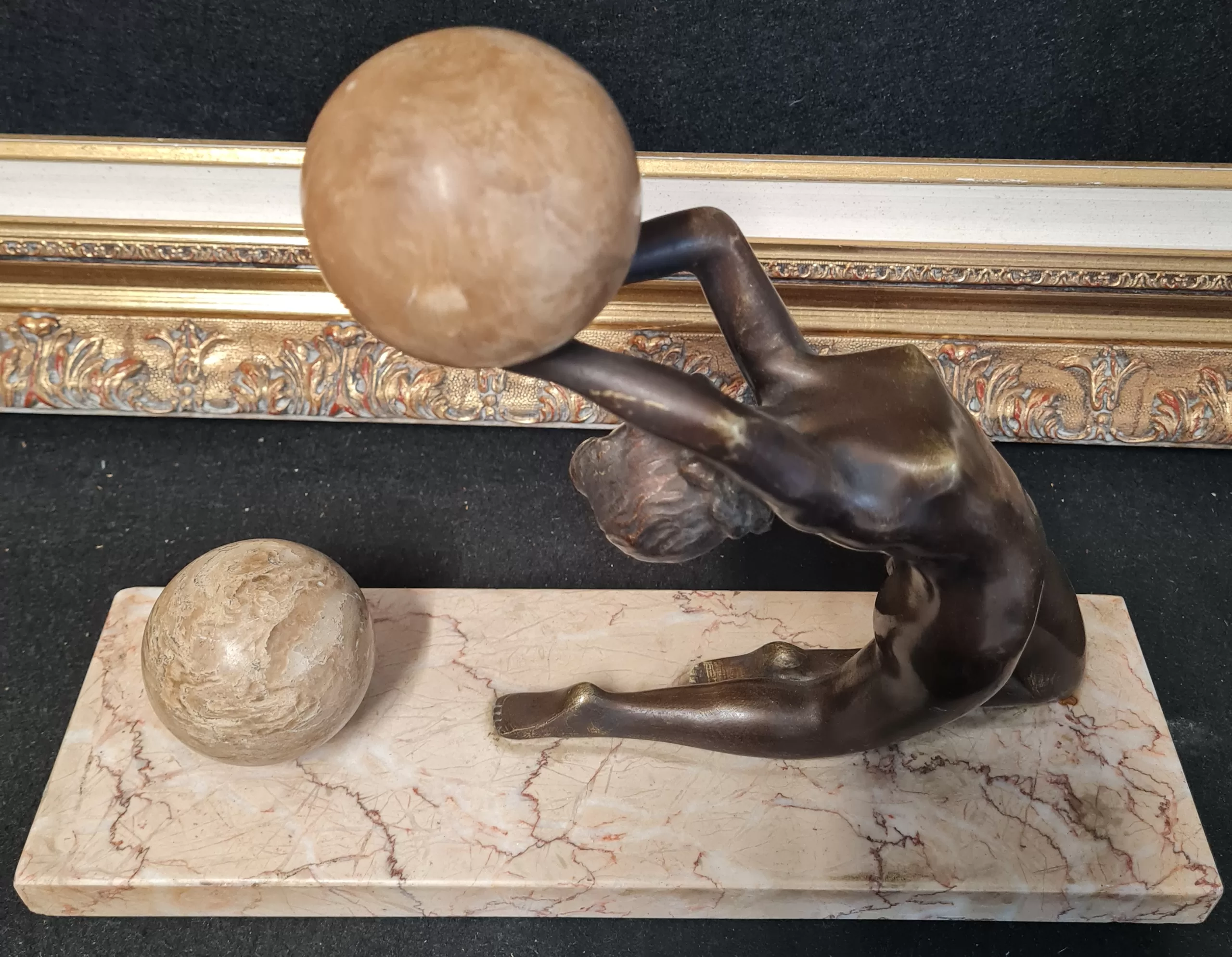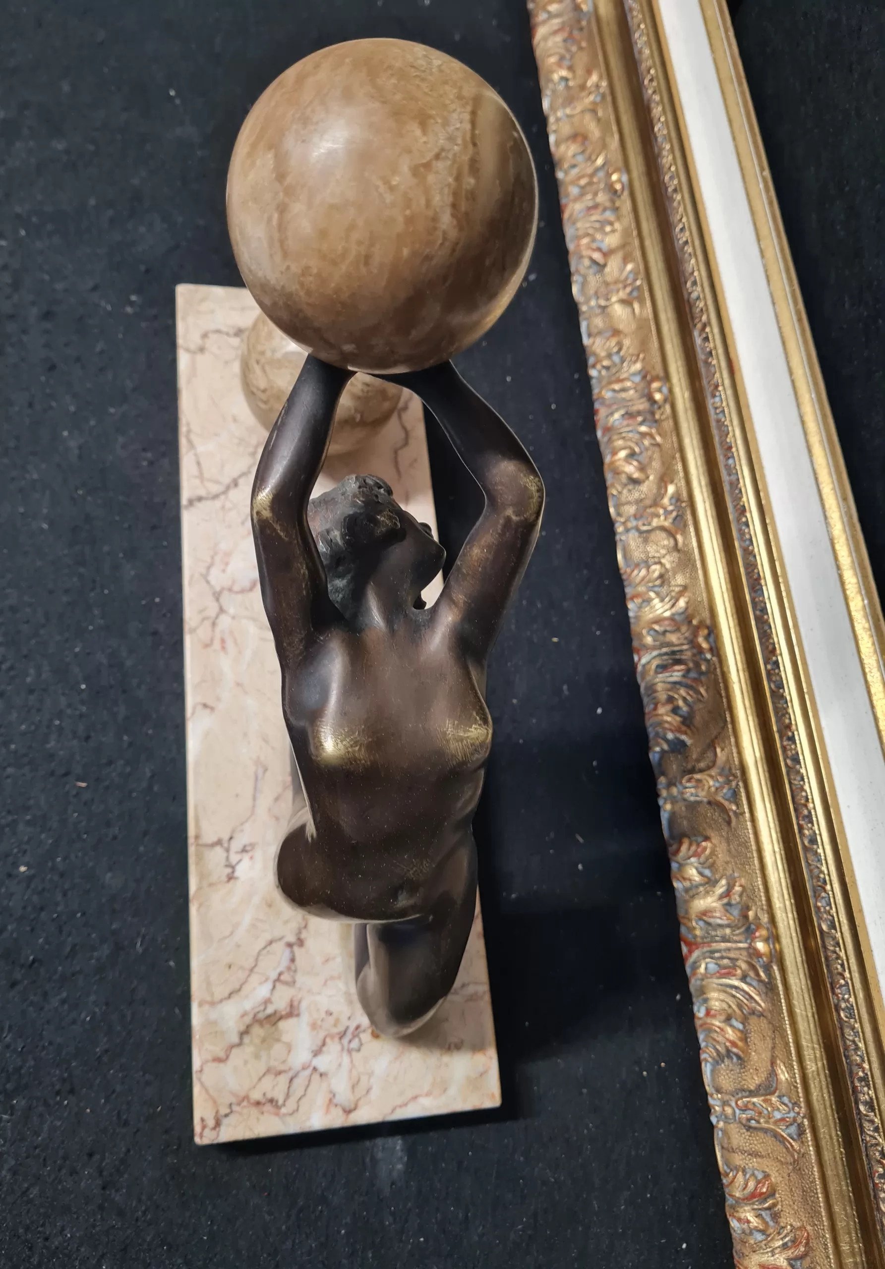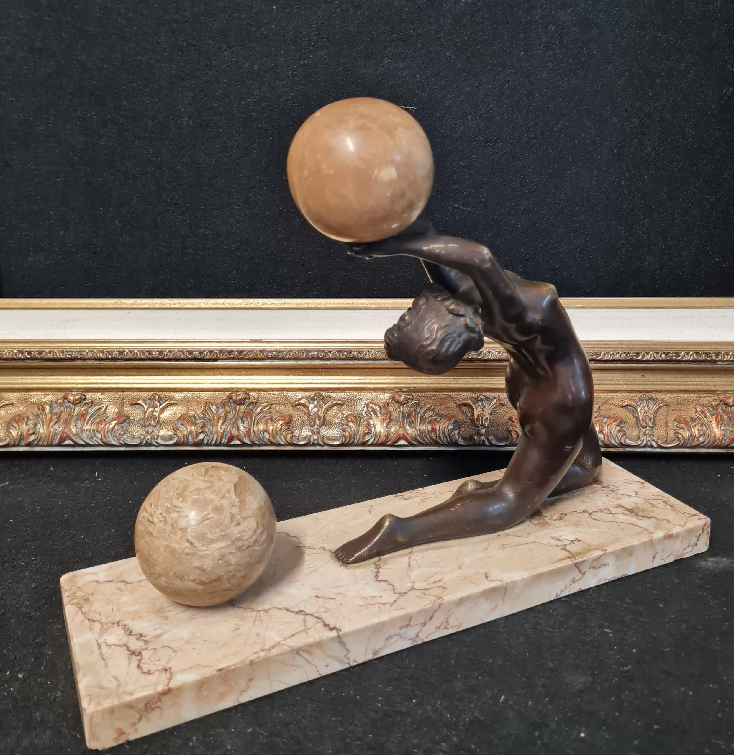 Jolie et élégante sculpture en bronze de Salvatore MELANI (1930) patiné marron foncé socle rectangulaire en marbre. 2 boules d’origine en onyx marron.