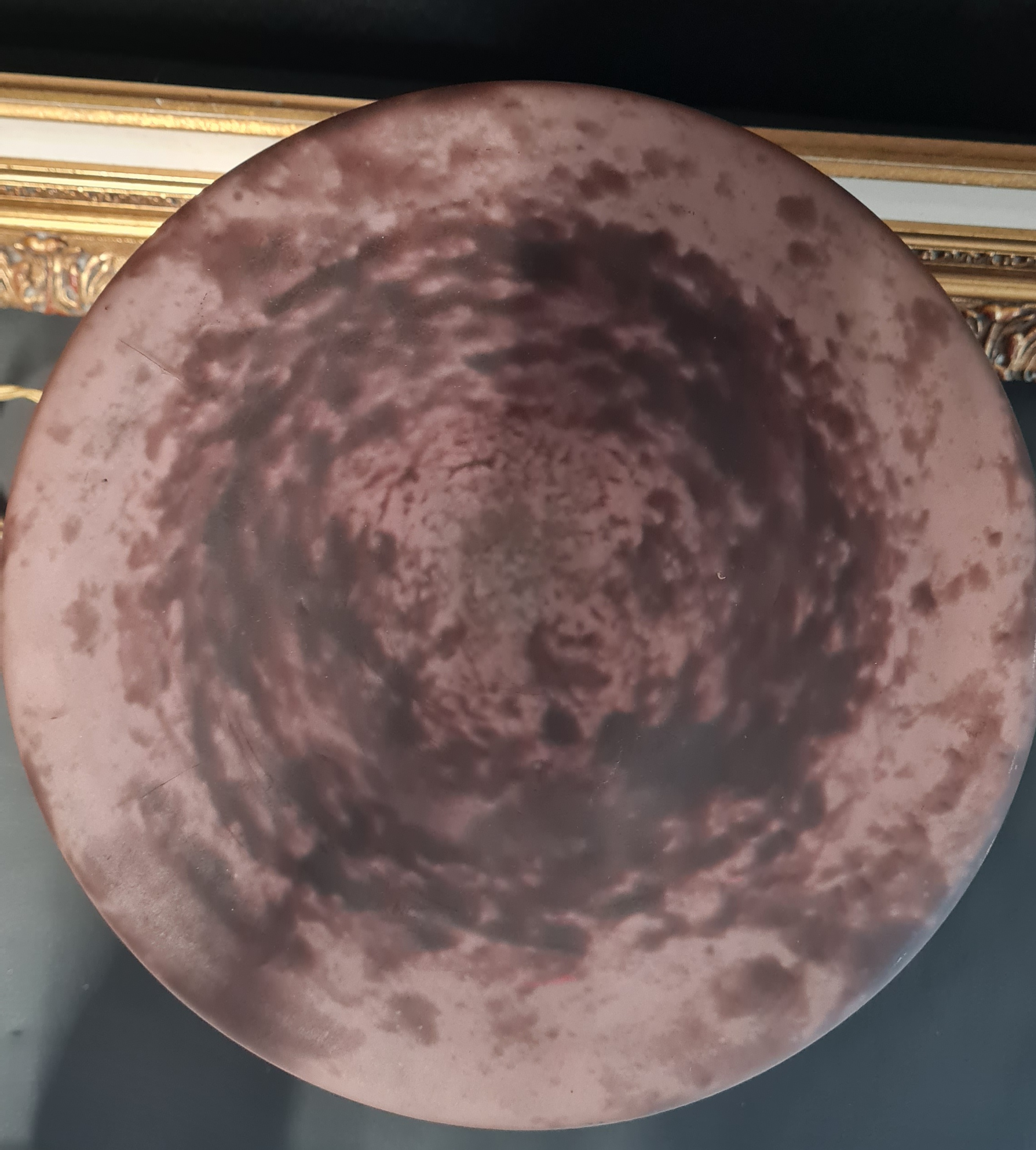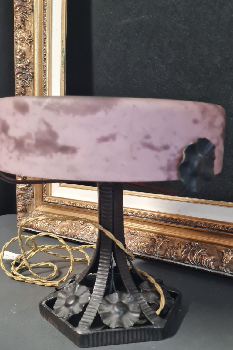 Très belle lampe en fer forgé et abat jour en pate de verre marmoréen rosé dans le gout des frères MULLER à Lunéville.