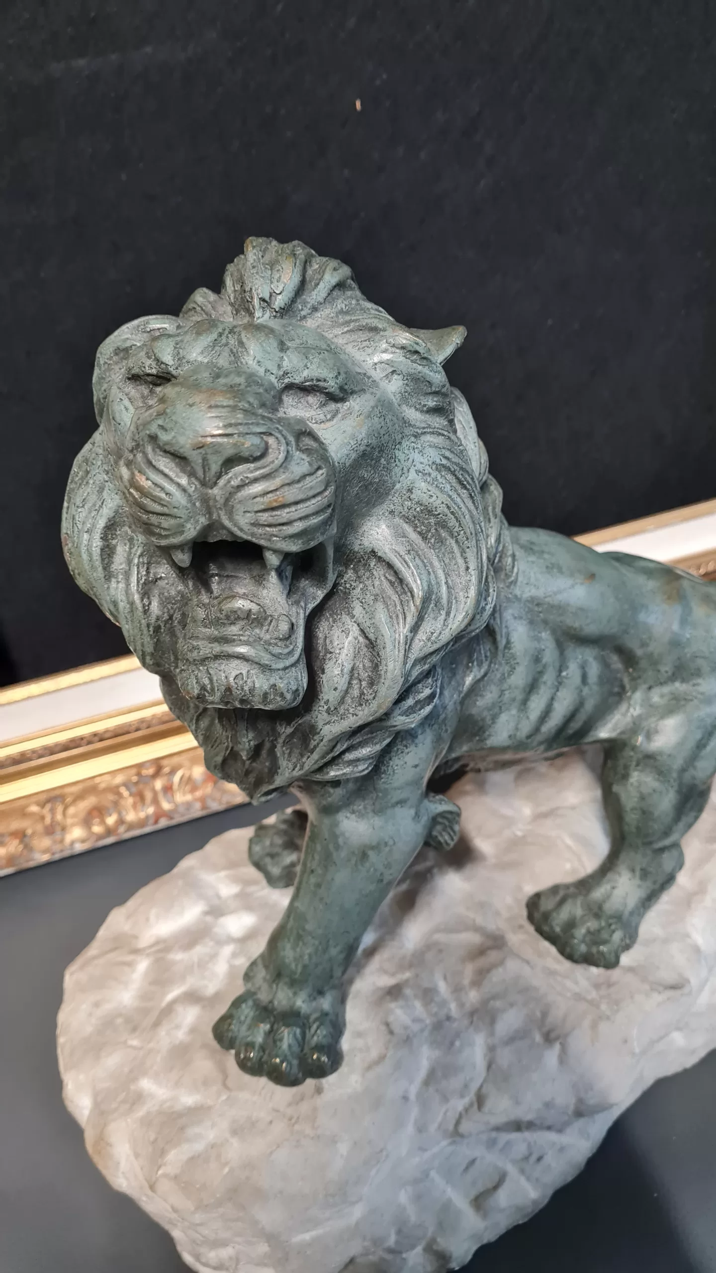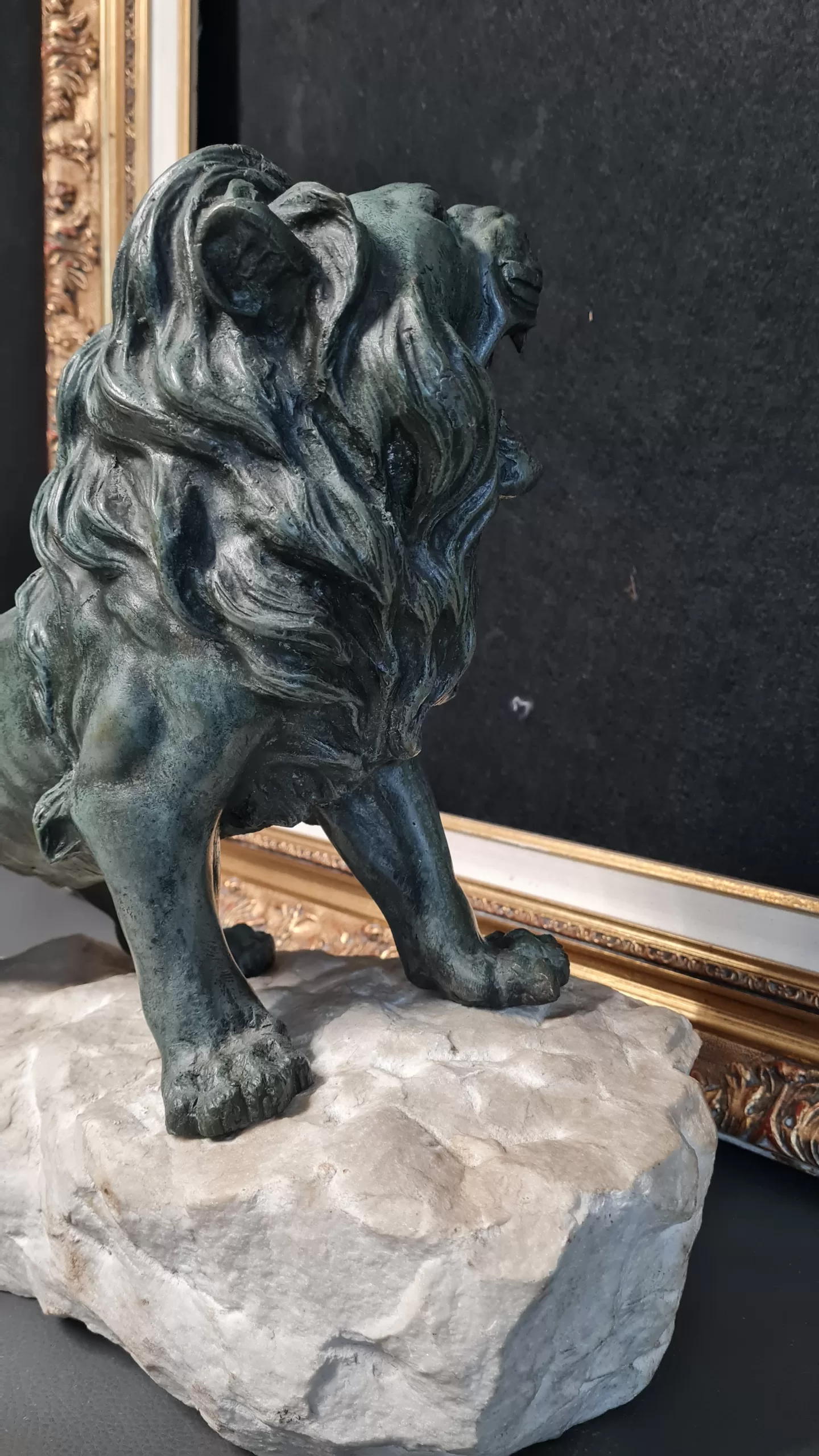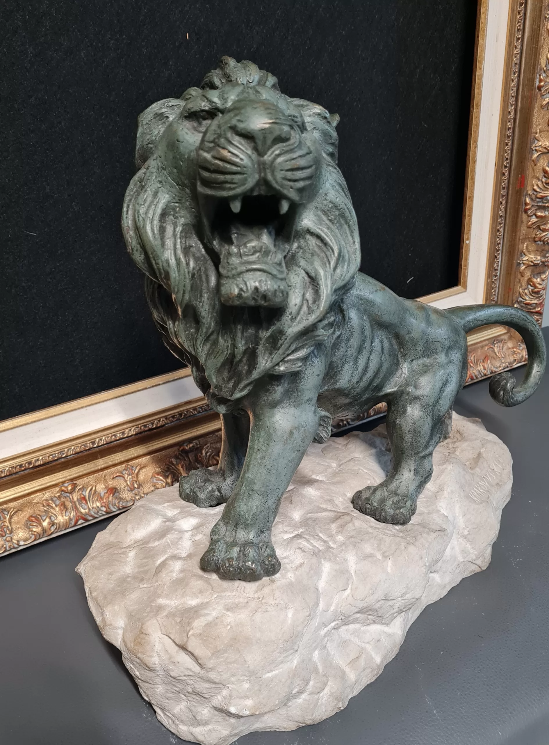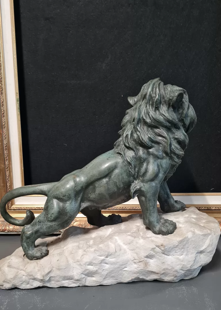 Superbe sculpture de KRAKOWSKI d’un lion rugissant en bronze  sur pierre  signé sur la terrasse.