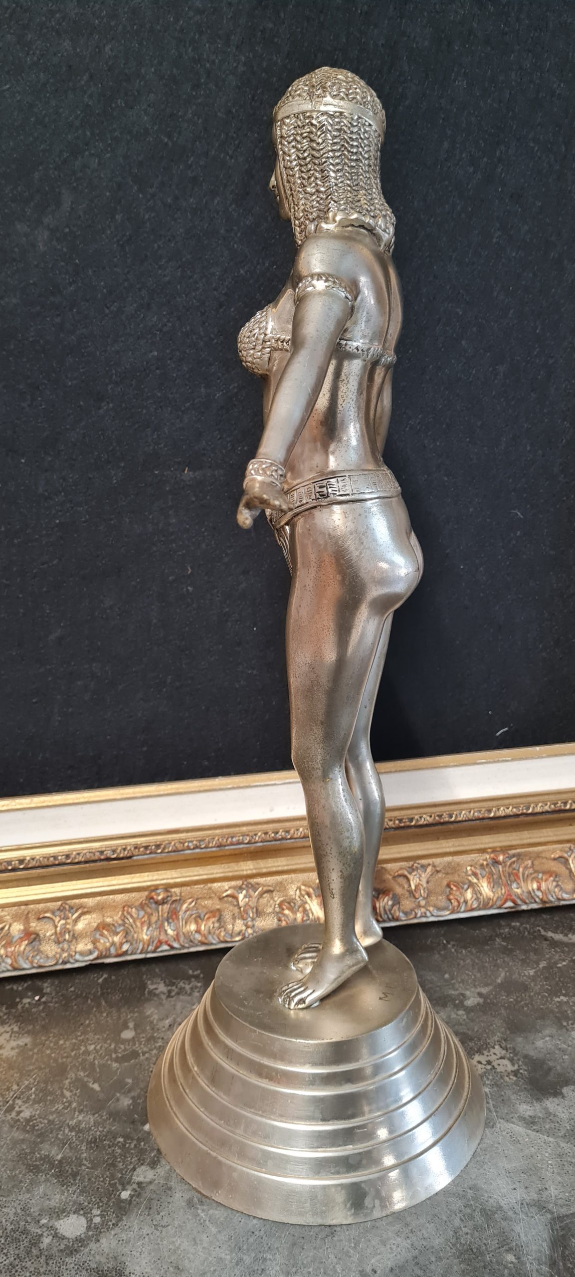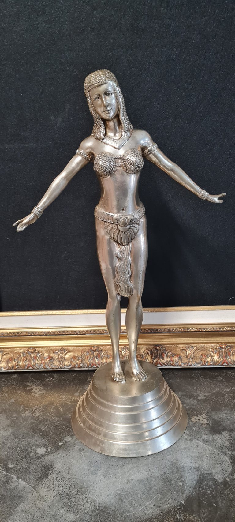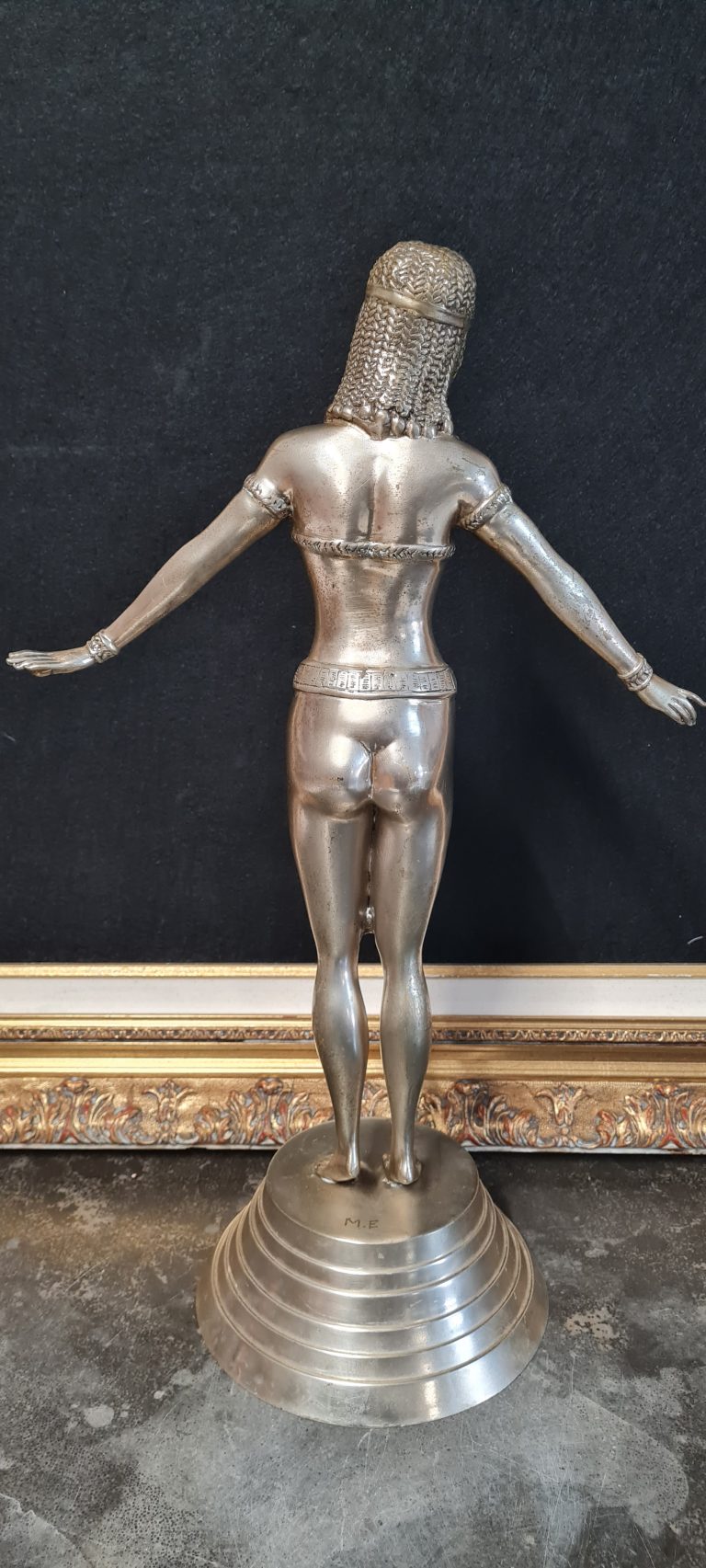 Magnifique Art déco figurant une femme stylisée aux bras ouverts, traitée dans un esprit archaïsant et géométrisé. Sujet en métal argenté, reposant sur une base circulaire à gradins.