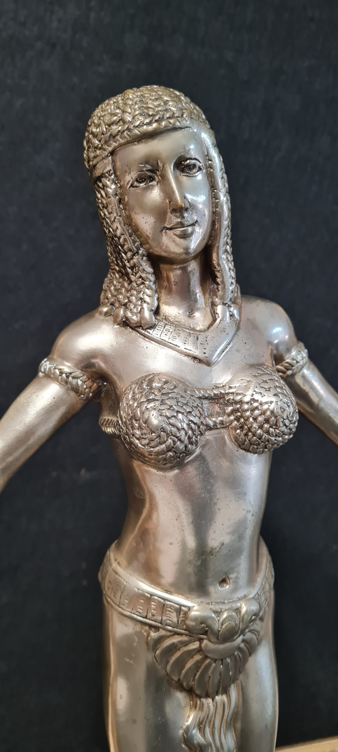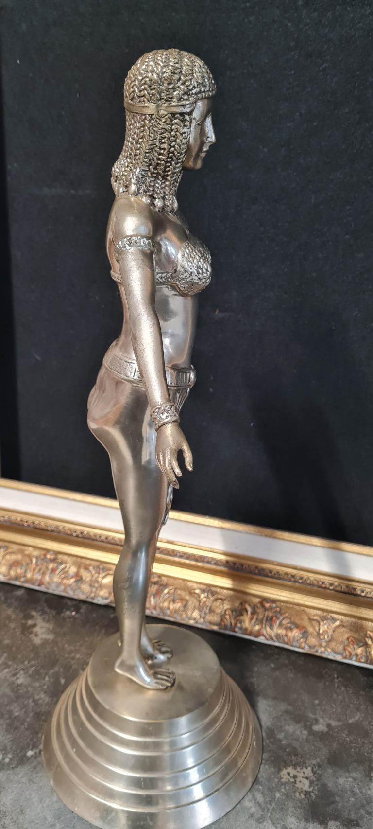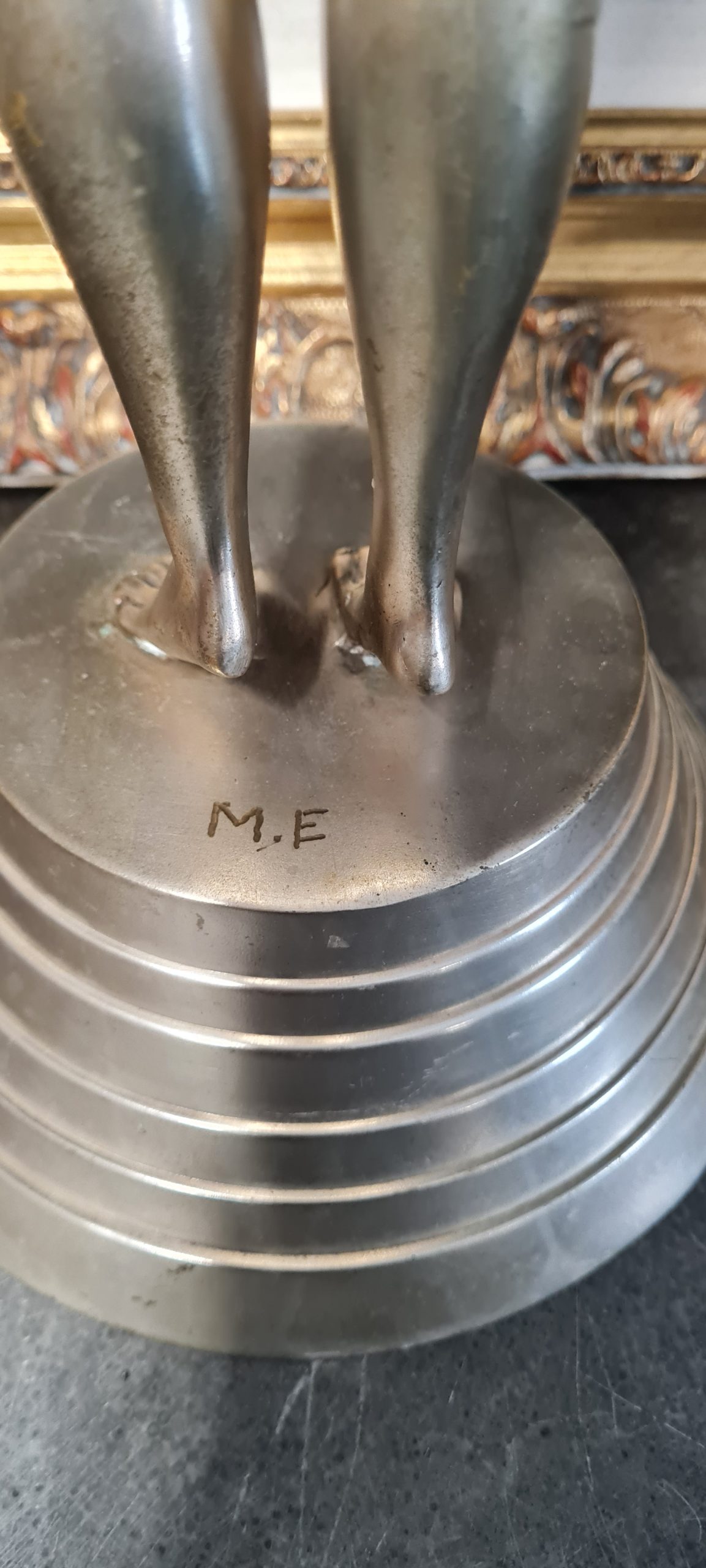 Magnifique Art déco figurant une femme stylisée aux bras ouverts, traitée dans un esprit archaïsant et géométrisé. Sujet en métal argenté, reposant sur une base circulaire à gradins.